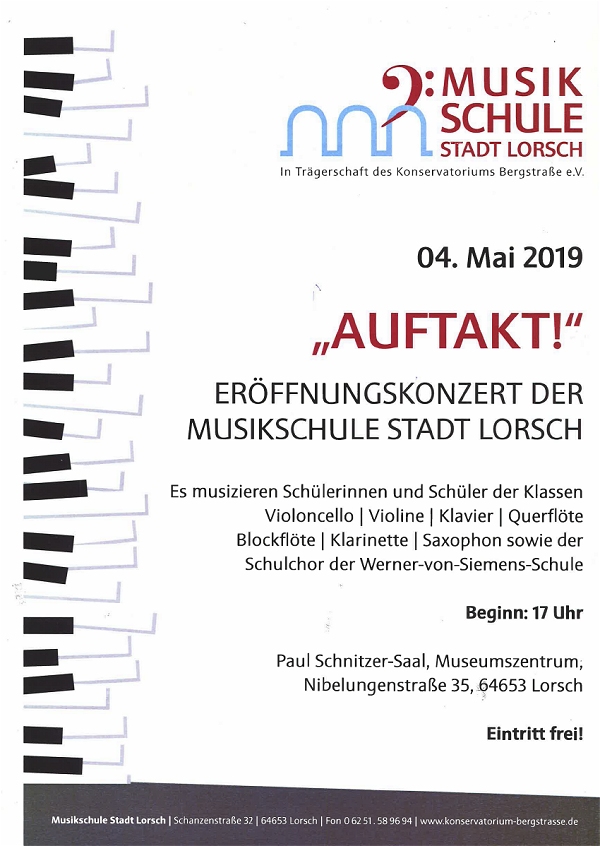 Die Jüngsten sind um die zehn Jahre, die ältesten Vortragenden hingegen studieren schon. Zu hören sind u.a. Werke von Händel, Mozart, Debussy oder auch Chopin. Außerdem wird der Schulchor der Werner von Siemens-Schule zu hören sein und unter Leitung von Birgit Grüner eine Schulhymne vortragen. Viel hat sich nicht geändert, die Musikschule bleibt in der bewährten Trägerschaft des Konservatoriums Bergstraße. Jedoch wird sie nun u.a. von der Stadt Lorsch finanziell noch stärker und auch personell unterstützt. Vor allem soll die Bekanntheit der Musikschule in der Stadt gesteigert werden. Nicht nur, dass es nun ein eigenes Logo gibt einen neuen, ansprechenden Auftritt was Plakate und Geschäftspapiere betrifft: